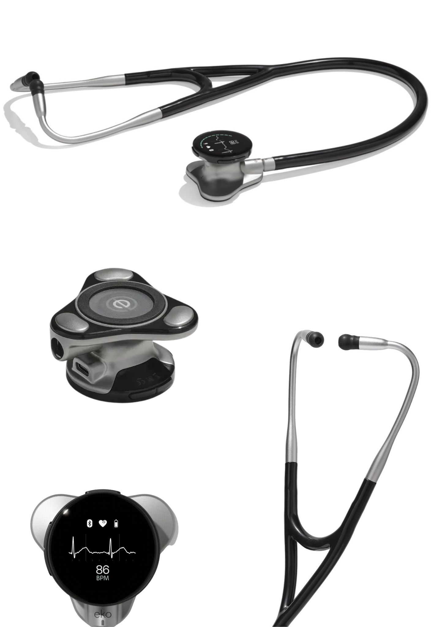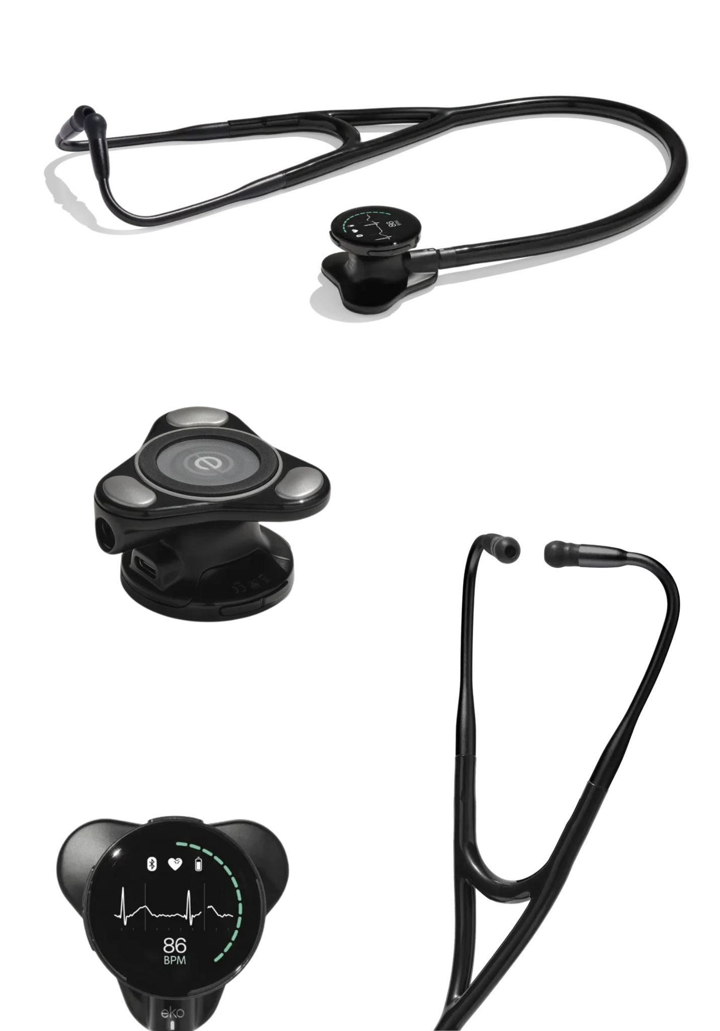 - Optional: Eko+ AI (subscription via the app): automatic detection of murmurs and atrial fibrillation