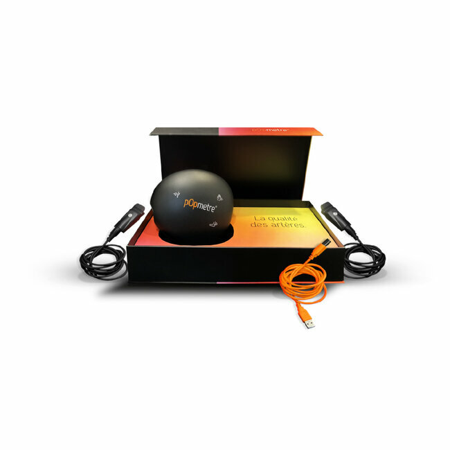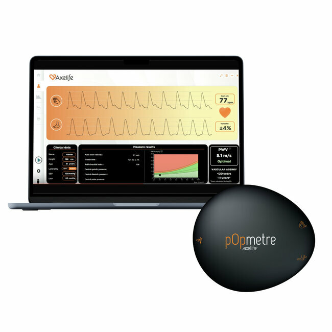 The pOpmètre® Axelife is a Class IIa medical device designed for non-invasive, rapid, and automated assessment of arterial stiffness. Using dual photoplethysmographic sensors, it measures pulse wave velocity (PWV) in just 14 seconds, without a cuff or occlusion, providing reliable, comfortable, and standardised results directly from a Windows 10 or 11 device.