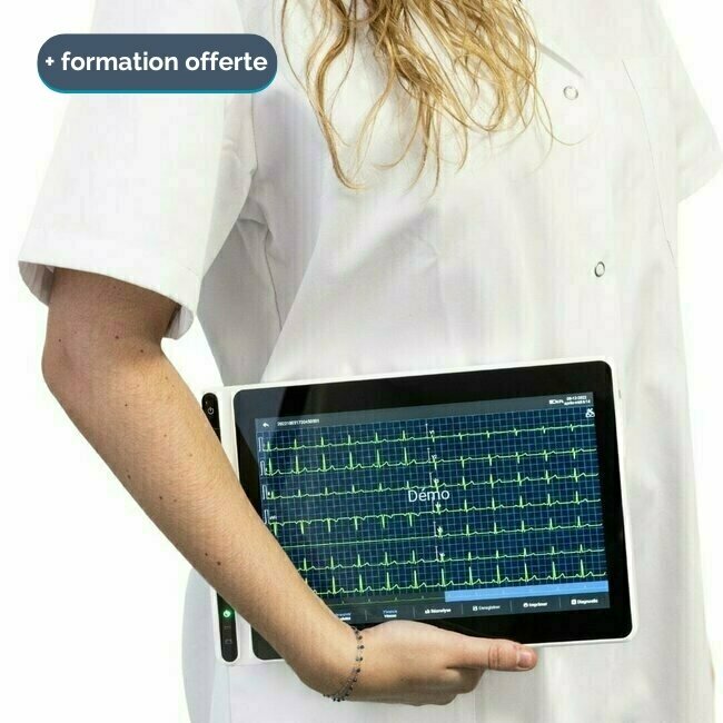 - A large high-resolution touch screen : take advantage of a large high-resolution touch screen by choosing the 10-inch version with its printer base (in option). The AZERTY keyboard offers you the possibility to edit and digitally sign the ECG. In addition, its tilting support significantly improves working comfort.